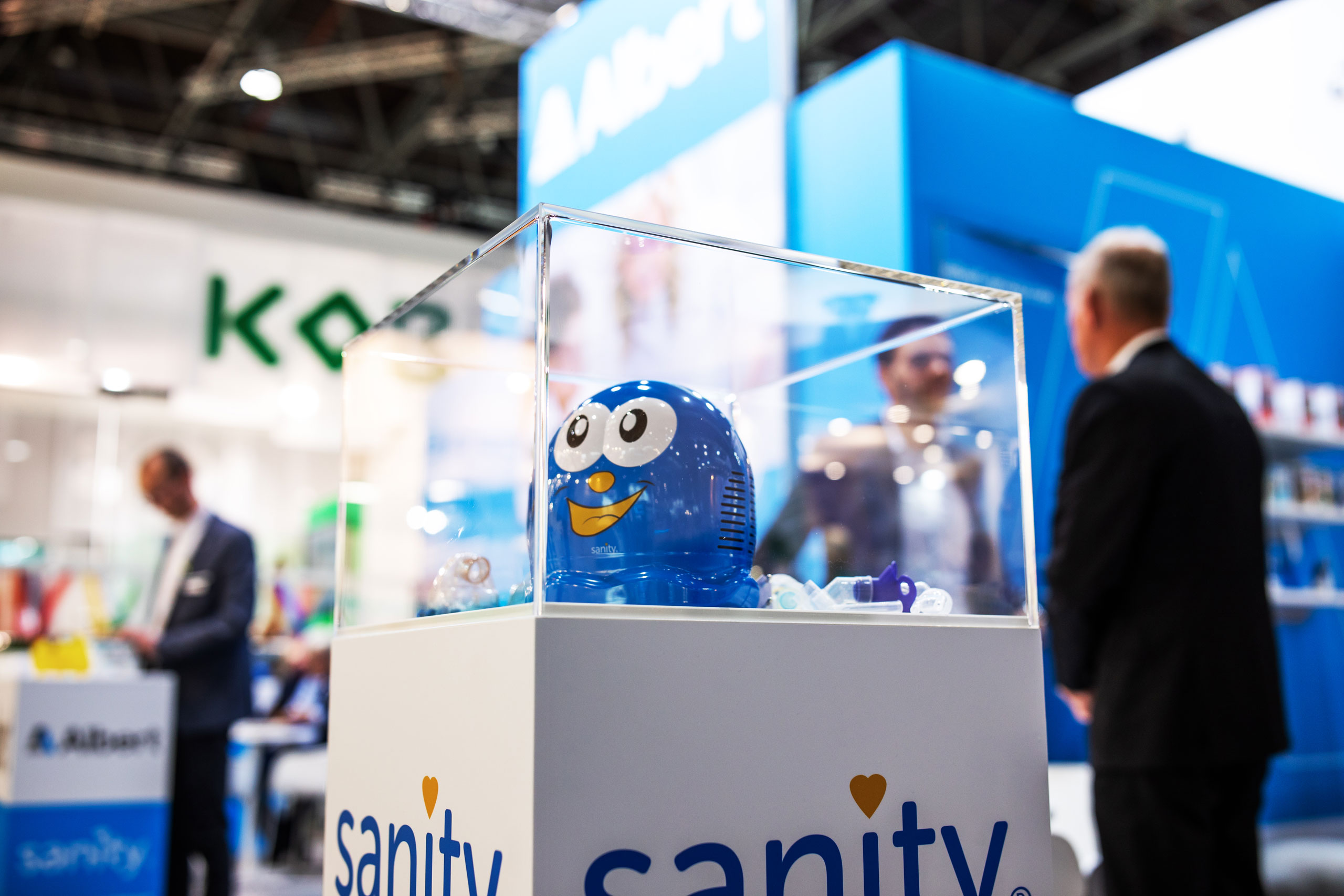 Ein zentrales Element der Markenpräsenz ist der Messeauftritt, der regelmäßig von uns gestaltet wird. Hier präsentieren sich die verschiedenen Geschäftsbereiche sowie die Untermarken sanity und tapMedic gemeinsam unter dem Dach der Marke Albert. Der weithin sichtbare Stand im charakteristischen Albert-Blau sorgt für klare Wiedererkennung. Ein modulares System-Messebaukonzept wird durch individuelle Maßanfertigungen ergänzt und schafft Raum für die Produktinszenierung mit technischem Anspruch und Markenstärke.