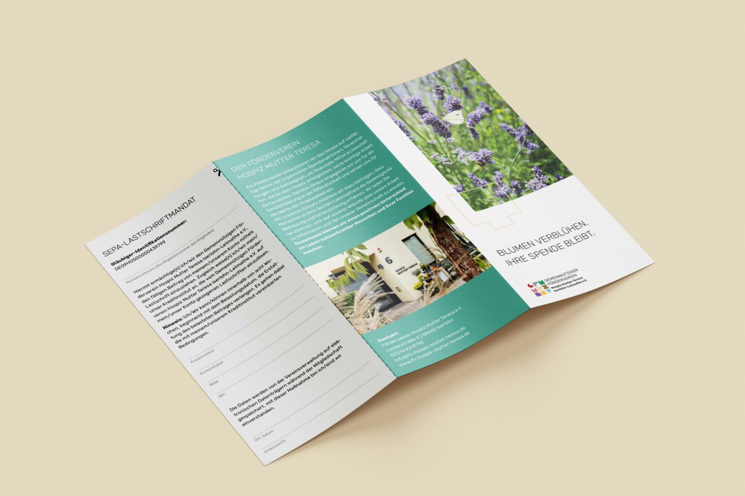 Wir unterstützen den gemeinnützigen Förderverein des Hospiz Mutter Teresa in Letmathe bei der Kommunikation. So entstand im Jahr 2024 ein neues Logo für den Förderverein. Die Initialen der sperrigen Vereinsbezeichnung wurden in abstrakte Lettern gesetzt und farbig hinterlegt.
