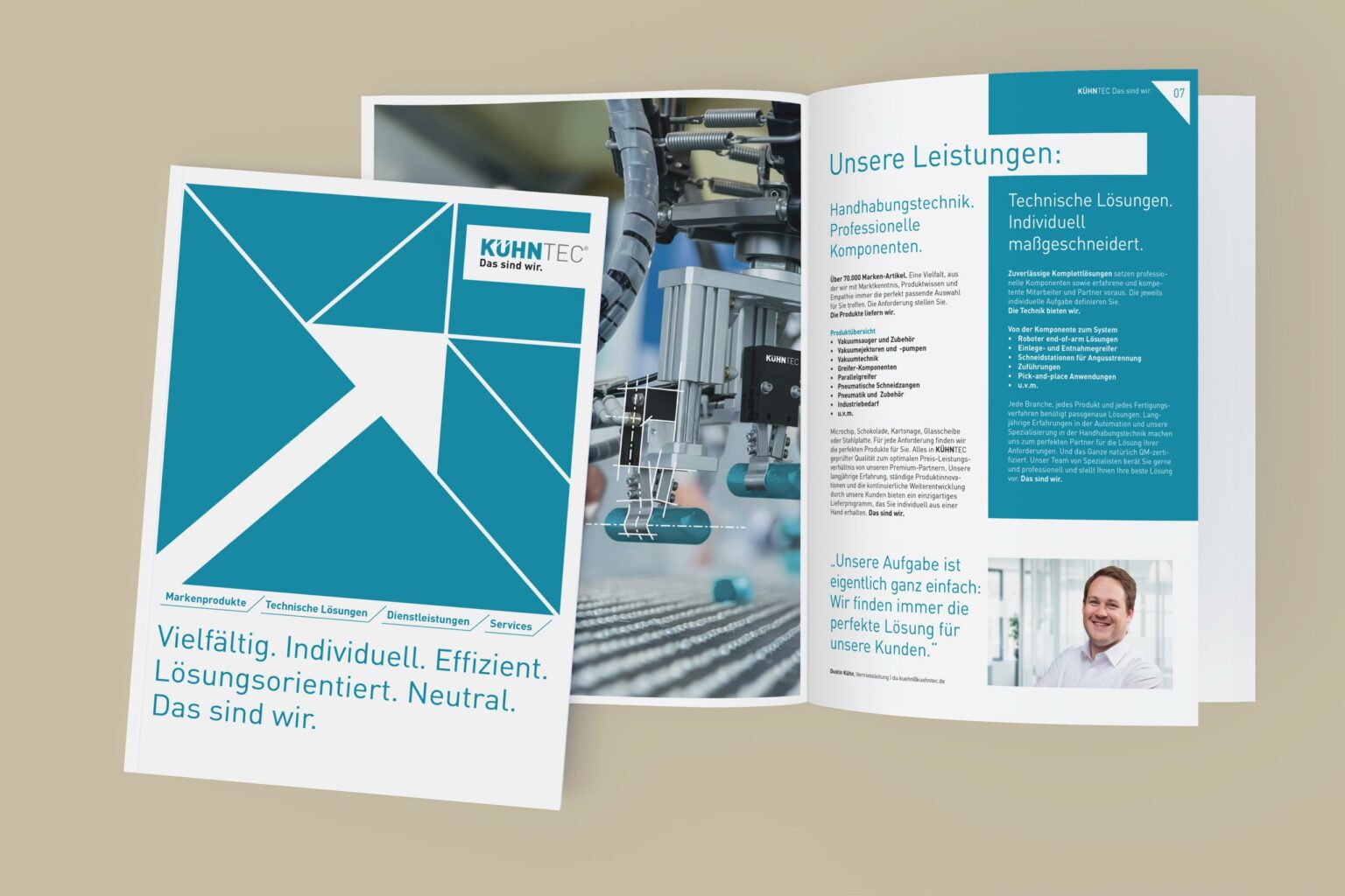 Seit 2017 begleiten wir KÜHNTEC, einen Anbieter von individuellen Handhabungslösungen, bei der Entwicklung und Weiterführung seiner Markenidentität. Entstanden ist eine Markenkommunikation, von Logo und Corporate Design über Farbwelt bis zur Website, die die technische Kompetenz und den