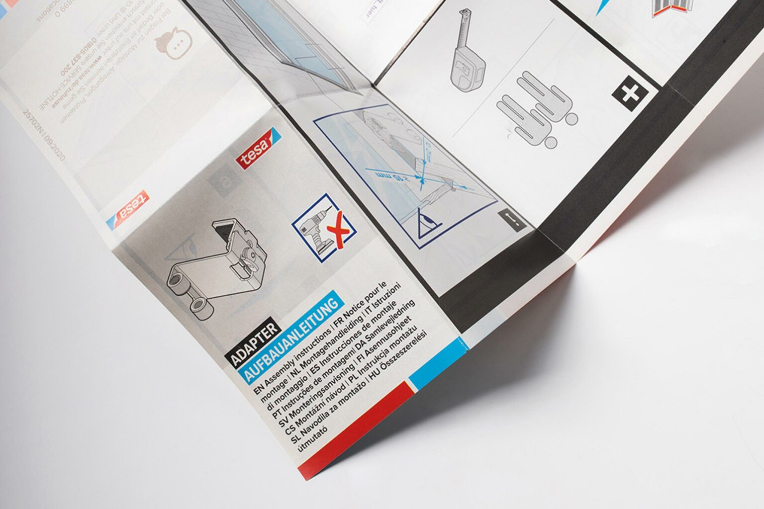 Nach der Konzeption und Definition der Standards für die Aufbauinstruktionen werden diese kontinuierlich in diversen Anleitungen umgesetzt und sind heute sowohl im Fach- als auch Baumarkt aufzufinden. Vom Faltblatt bis zur umfangreichen Heftlösung, wer tesa am Fenster oder der Tür montiert, der tut das mit unter anhand unserer Montagevorgaben in primär bebilderter Form. So werden auch komplexe Handlungskombinationen gut nachvollziehbar verständlich kommuniziert und tragen für ein positives After-Sales-Empfinden und Stärkung der Marke bei.